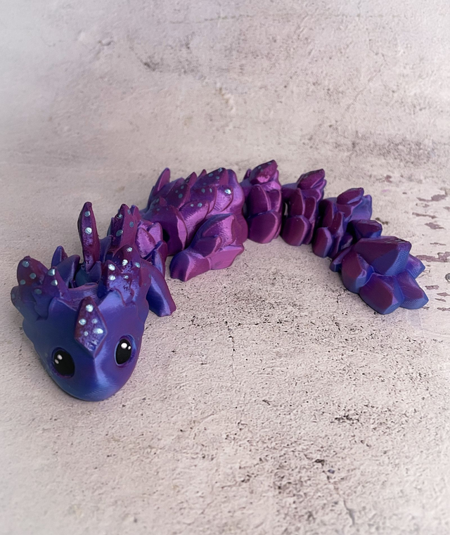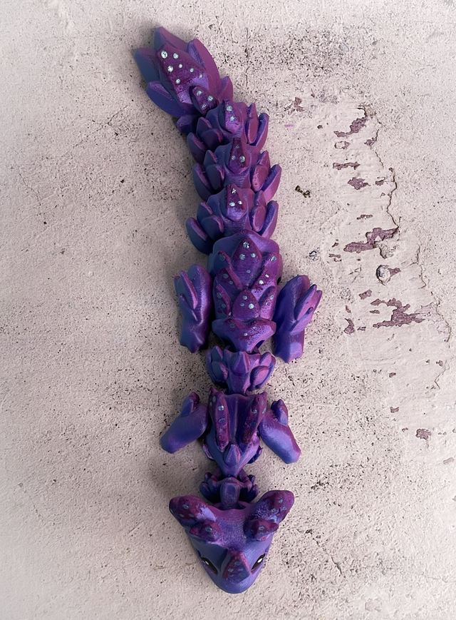 Tento flexi drak vytištěný na 3D tiskárně je víc než jen dekorace – je to malý kousek fantazie, který oživí každou knihovnu či pracovní stůl. Díky svému pohyblivému tělu se ladně přizpůsobí jakékoli pozici – může se vinout mezi knihami, odpočívat na hřbetech svazků nebo střežit tvůj oblíbený román. Vhodný i jako hračka pro děti - velmi odolný.