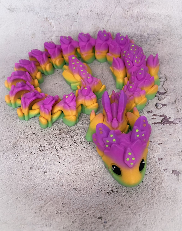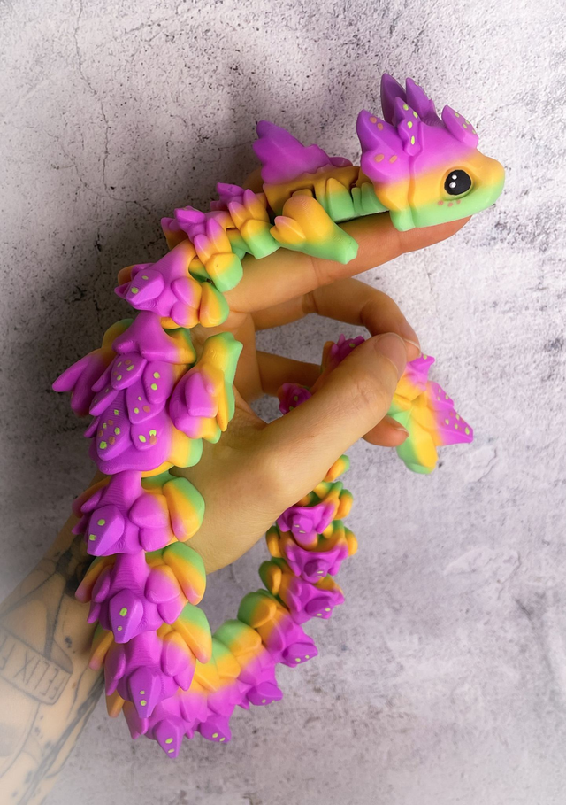 Tento flexi drak vytištěný na 3D tiskárně je víc než jen dekorace – je to malý kousek fantazie, který oživí každou knihovnu či pracovní stůl. Díky svému pohyblivému tělu se ladně přizpůsobí jakékoli pozici – může se vinout mezi knihami, odpočívat na hřbetech svazků nebo střežit tvůj oblíbený román. Vhodný i jako hračka pro děti - velmi odolný.