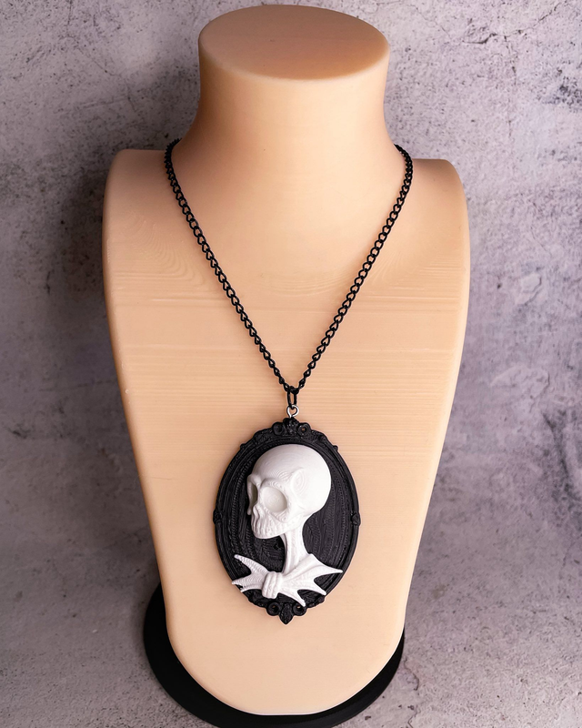 Přívěšek náhrdelníku inspirovaný stylem gothic je vytvořen pomocí 3D tisku, ozdoben korálkem a zavěšen na bižuterním řetízku.