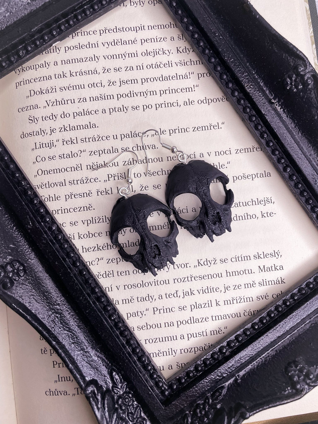 Motivy kostí a lebek, vytvořené pomocí 3D tisku (nejde o skutečné kosti), nesou temnou energii, mystiku a respekt k přírodním cyklům. Každý pár působí jako talisman – výrazný, magický a naprosto originální. Každý kousek je jedinečný.