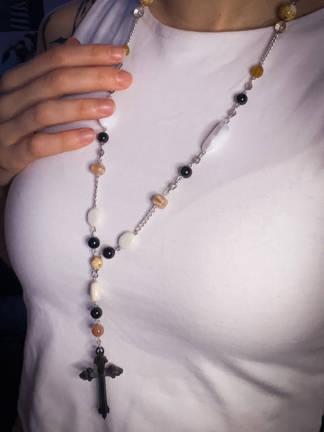 Materiál: Černé, bílé a krémové korálky a stříbrné řetízky doplněné 3D tištěným přívěskem