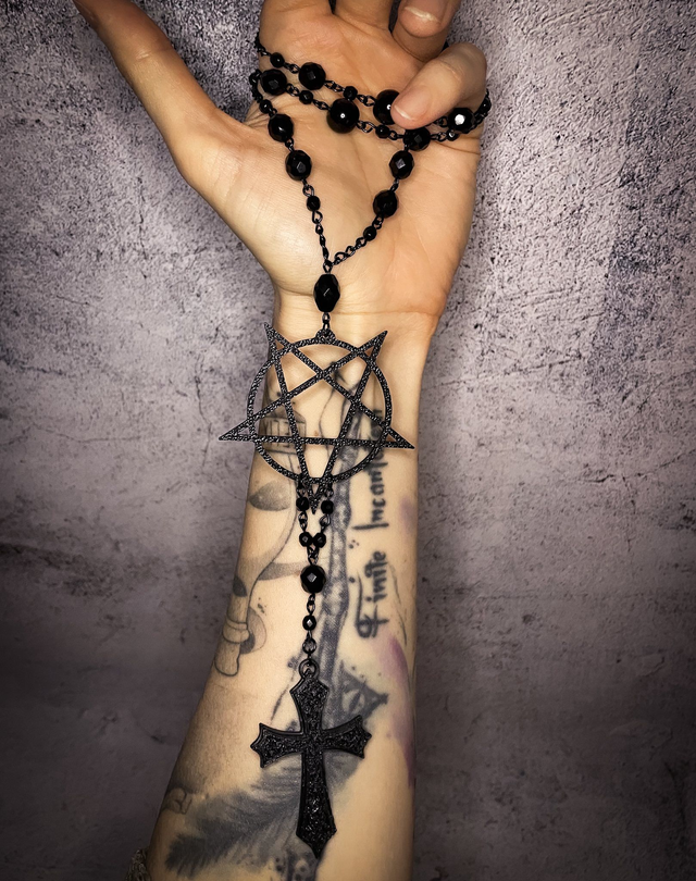 Ponoř se do světa temné elegance s tímto unikátním náhrdelníkem, který spojuje gotický styl s mystickými symboly. Tento krucifix s obráceným pentagramem a tradičním křížem je dokonalým doplňkem pro každého, kdo miluje dark fashion, okultní estetiku a precizní ruční práci.