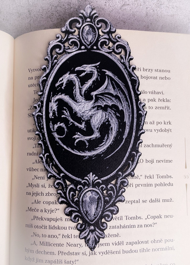 Pro všechny milovníky knih a fantasy! Tato tenká a pružná záložka oživí vaše čtenářské zážitky. Vyrobena metodou 3D tisku (3D malba). Originální grafika, která zaujme na první pohled. Motiv inspirovaný Hrou o trůny.
